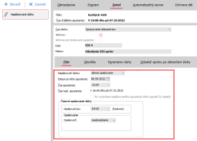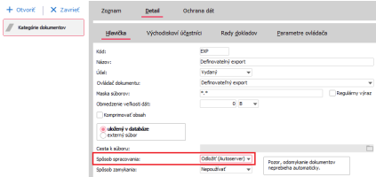 V agendě Kategórie dokumentov u dokumentů Definovatelný import a Definovatelný export nastavte na záložce Detail, Hlavička položku Způsob zpracování na hodnotu Odložit (Autoserver) pro automatické zpracování pomocí naplánovaných úloh (Doporučená volba). Případně volbu Automaticky či Ručně, pokud pro zpracování dokumentů nebudete využívat automatizační server.