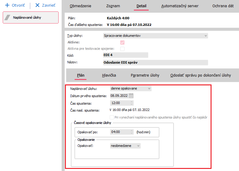 V Detailu je potřeba přenastavit kdy a jak často se bude úloha spouštět. Hodnoty nastavené instalační sadou jsou pouze orientační.