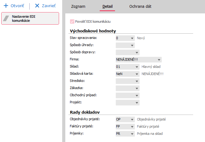 Návod je univerzální a je proto možné, že pro provoz ve vaši firmě budou potřeba další nastavení, nebo bude nutné nastavení provést jinak. V takových případech konzultujte Nastavenie EDI komunikácie s vašim konzultantem nebo obchodníkem.