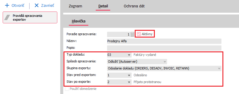 V Detailu je potřeba ověřit, že je pravidlo aktivní, je správně nastaven způsob zpracování a jsou nastaveny stavy Před exportem a Po exportu. Případně můžete ještě zatrhnout položku Použít omezení a upřesnit například konkrétní řadu dokladů a podobně.
