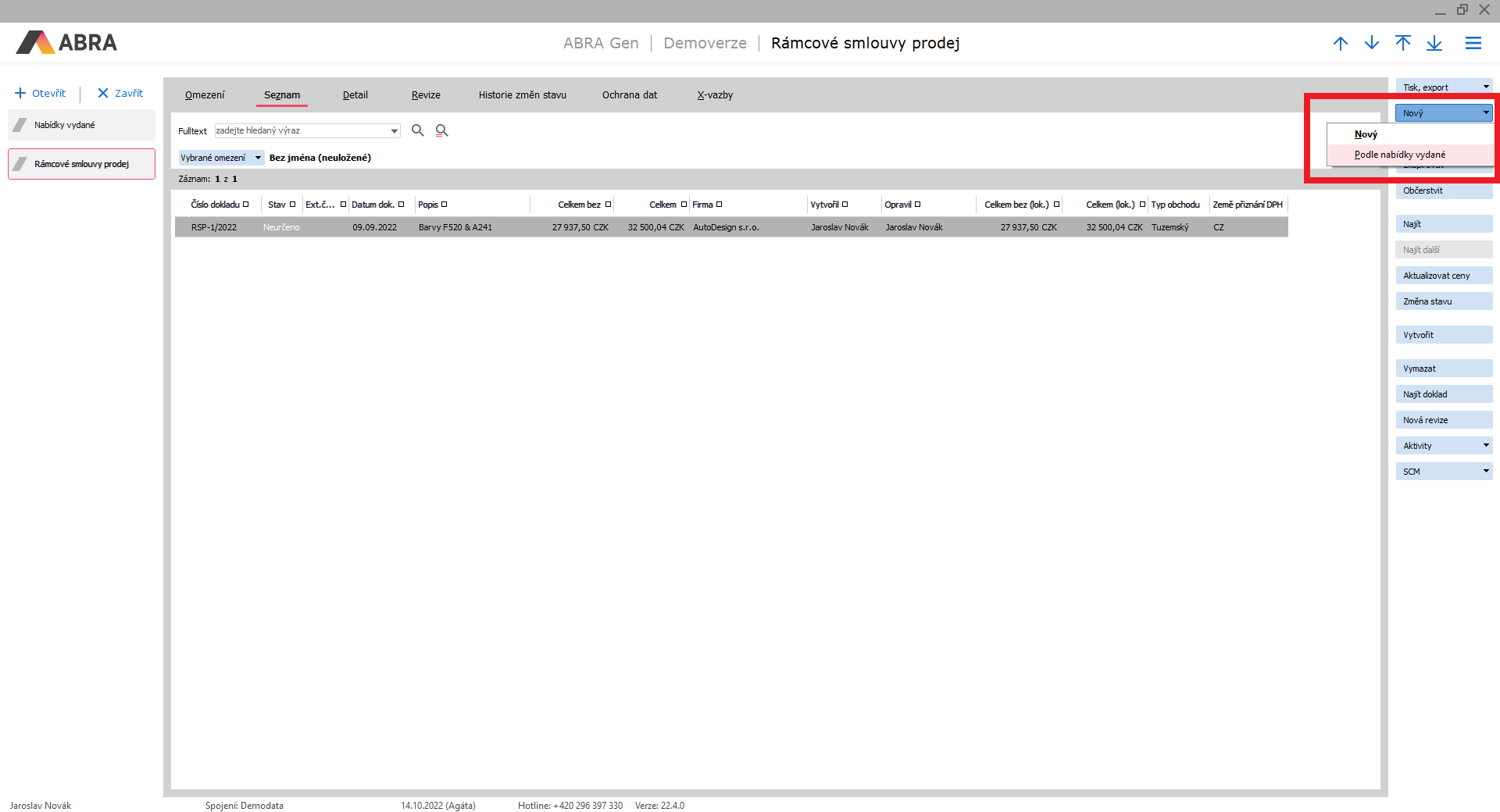 Otevřeme si agendu Rámcové zmluvy - predaj. Viz modul Predaj → záložka Ponuky a objednávky → agenda Rámcové zmluvy - predaj.