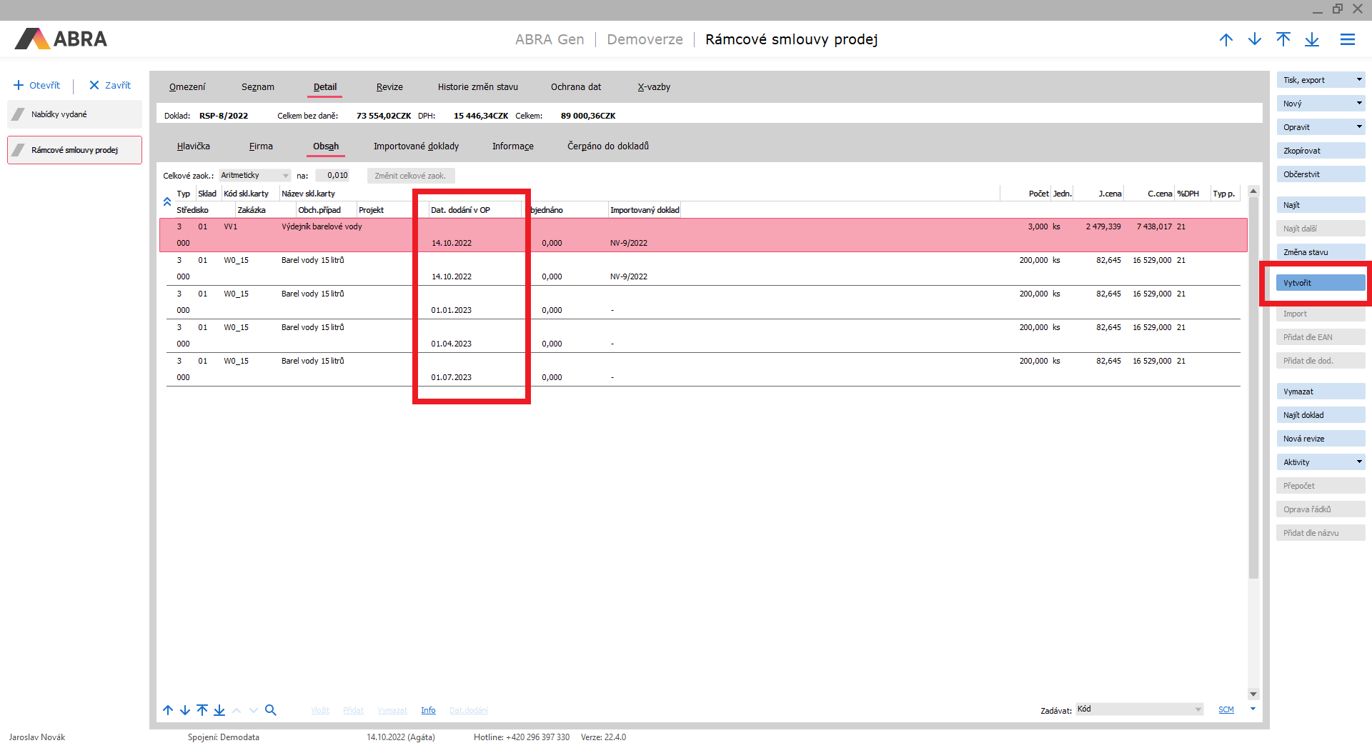 Pokaždé, když nastane domluvený termín dodání, vystavíme potřebné Objednávky vydané. Na jejich základě provedeme expedici zboží, které dodáme našemu odběrateli. Na dokladu Rámcová zmluva - predaj pak můžeme sledovat, kolik již bylo objednáno, kolik bylo již dodáno, kolik zbývá atd.