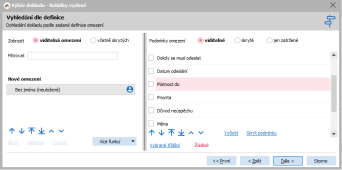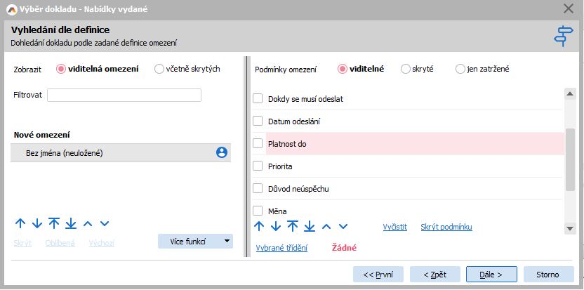 Zde jsou vidět konkrétní příklady 2 nejčastěji používaných metod. Vlevo je vyhledání dokladu podle jeho identifikace – celého názvu nebo jen části, vpravo lze vyhledat doklad podle libovolných hodnot. Například jen nabídky vydané, které mají "Platnost do" v určitém časovém intervalu.