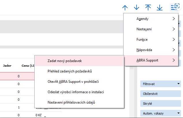 Spusťte ABRA Gen. Z jakékoliv otevřené agendy systému ABRA Gen přejděte do Hlavního menu → ABRA Support → Zadat požadavek.
