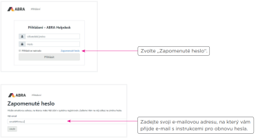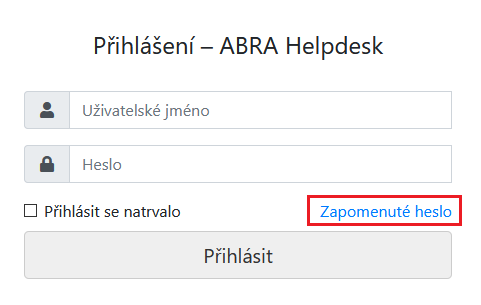 Pokračujte s vygenerováním nového hesla v internetovém prohlížeči na adrese helpdesk.abra.eu. Klikněte na odkaz Zapomenuté heslo.