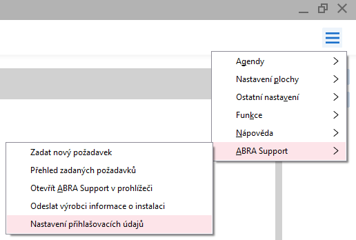 Jestliže znáte své přihlašovací údaje, můžete je zadat přímo do ABRA Gen. Hlavní menu → ABRA Support → Nastavení přihlašovacích údajů.