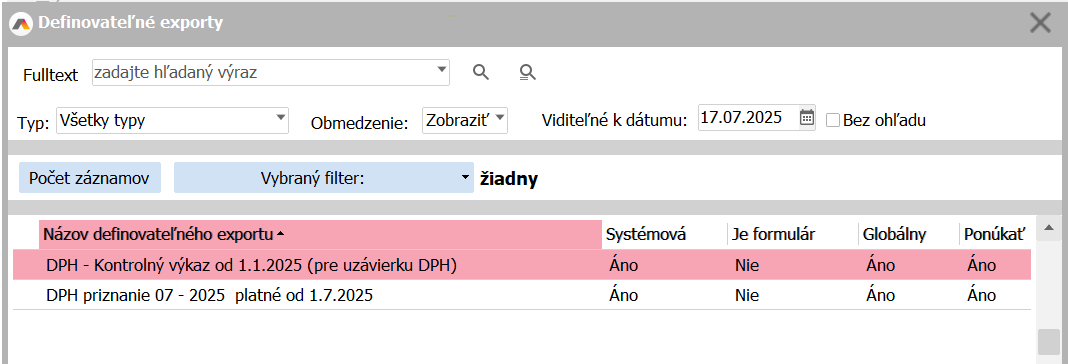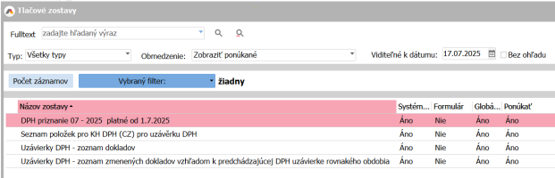 Pro tisk a export se používá DPH priznanie 07 - 2025 platné od 1. 7. 2025 a od 1. 1. 2025 sa používa nový export pre Kontrolný výkaz DPH.