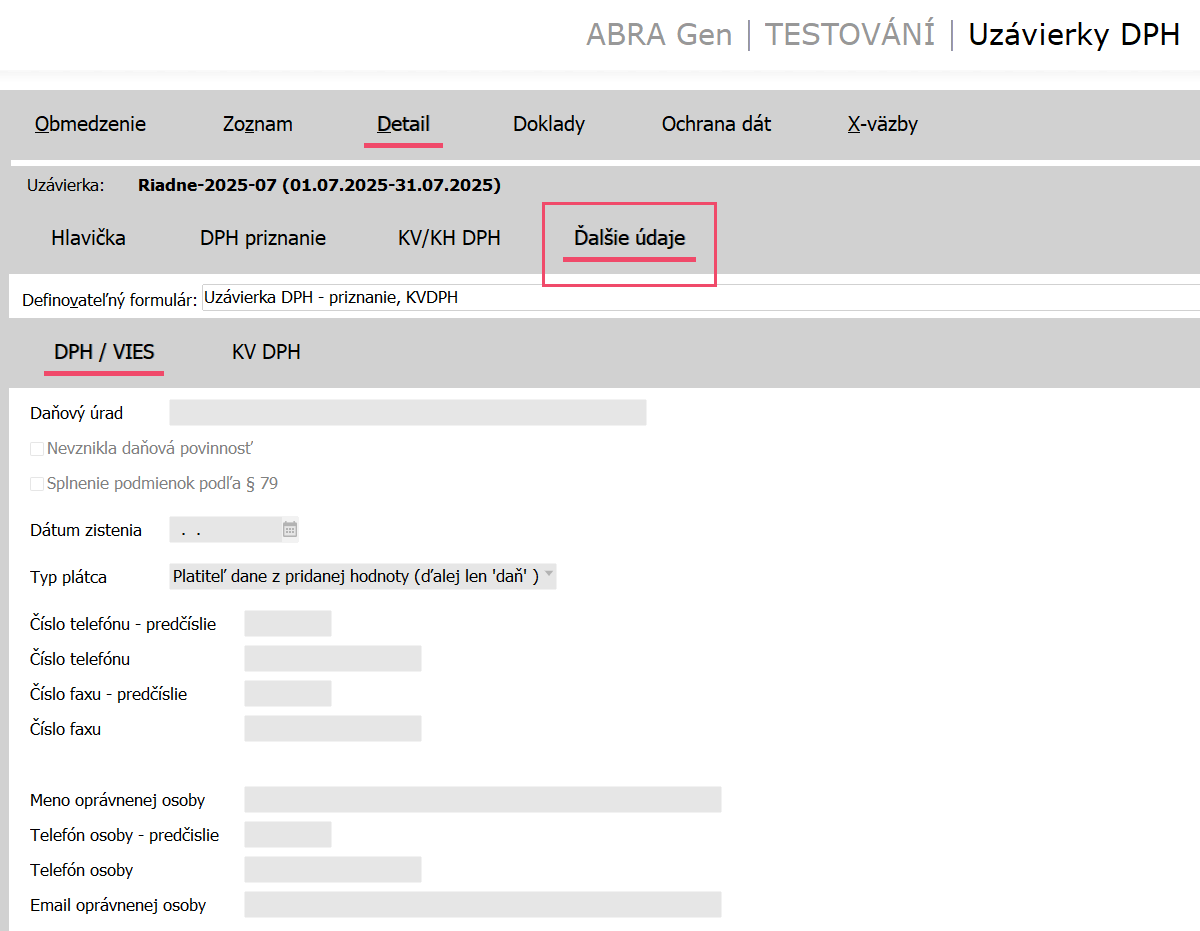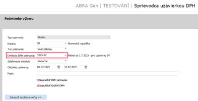 Od roku 2025 sa pre tuzemské podanie DPH priznania a KH DPH používa v systéme ABRA Gen aktuálna definícia priznania 2025-07. Pri tvorbe novej uzávierky DPH teda skontrolujte, že máte predvyplnenú túto definíciu.