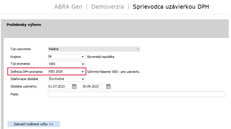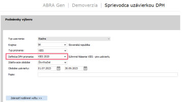 Pre priznanie VIES, teda Súhrnné hlásenie ESL, je nutné zvoliť poslednú platnú definíciu priznania, čo je v našom prípade definícia VIES 2020 platná od roku 2020.