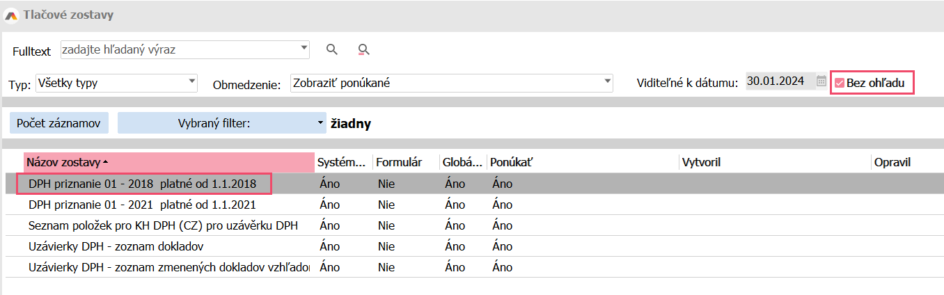 Tlačové reporty z agendy Prehľad DPH sa používajú len ku kontrolám pred generovaním podania a ku generovaniu reportov k záznamnej povinnosti, ktoré doklady do jednotlivých podaní vstúpili.