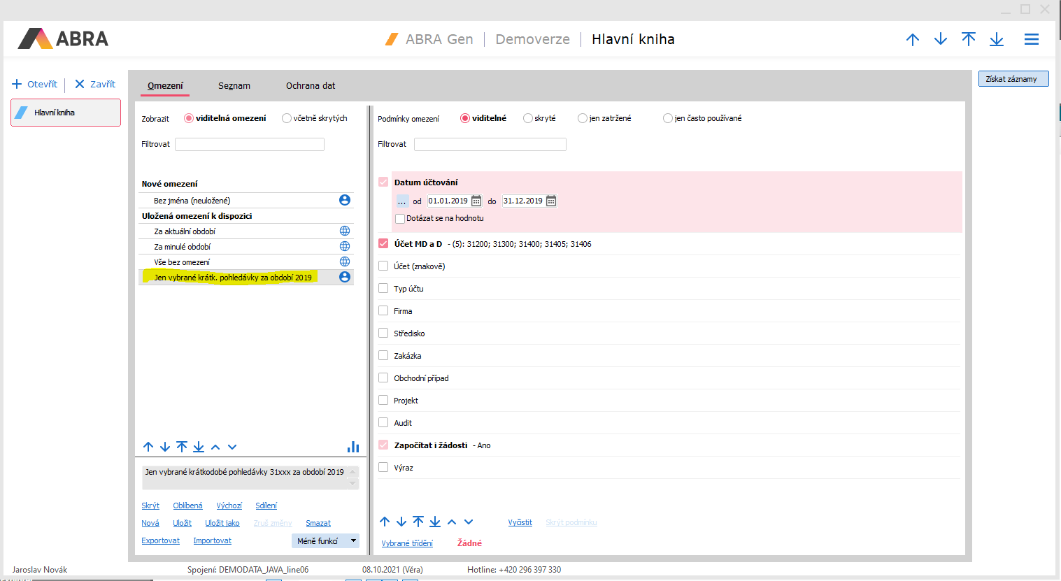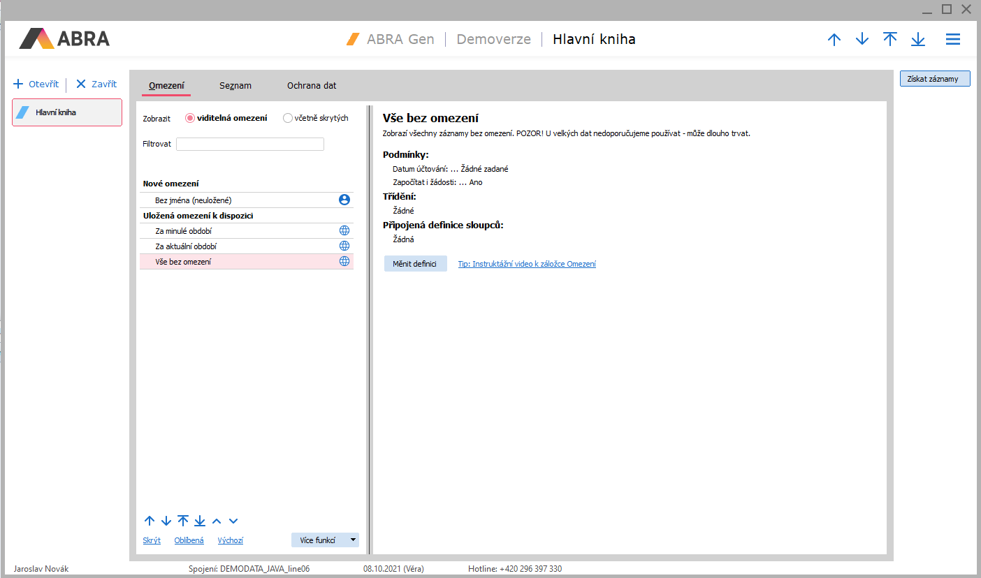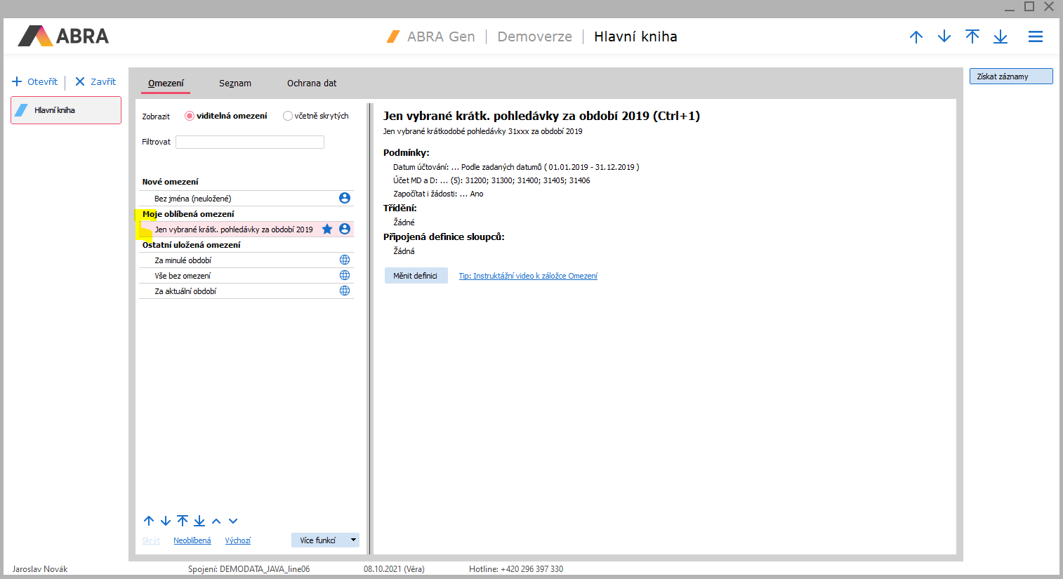 Odtud jej lze kdykoliv znovu vybrat a použít. Nejdříve kliknout na definici omezení, pak kliknout na tlačítko Získať záznamy. (Už není nutné znovu nastavovat omezující podmínky):