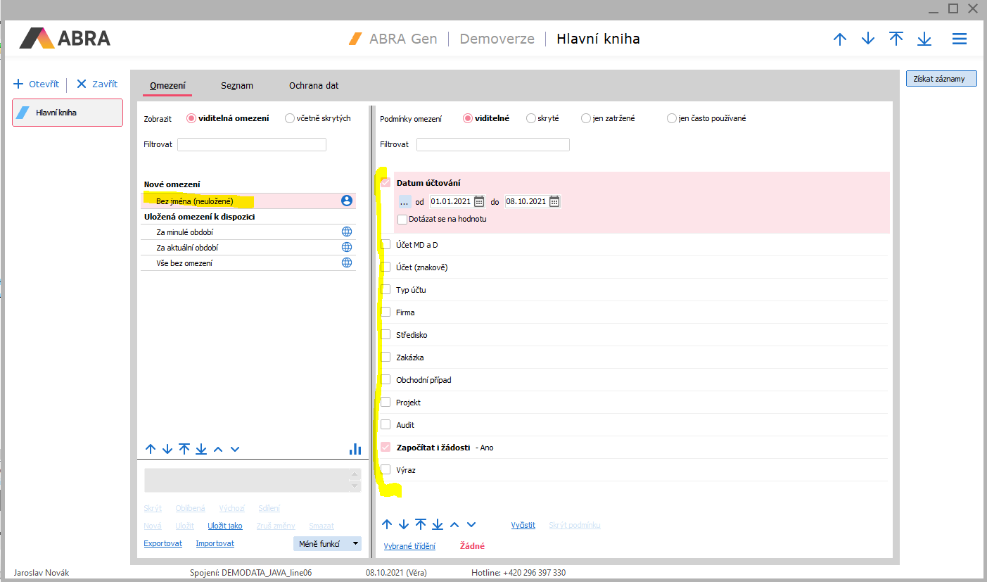 Kliknout na Bez mena (neuložené). Vpravo jsou nyní omezující položky: