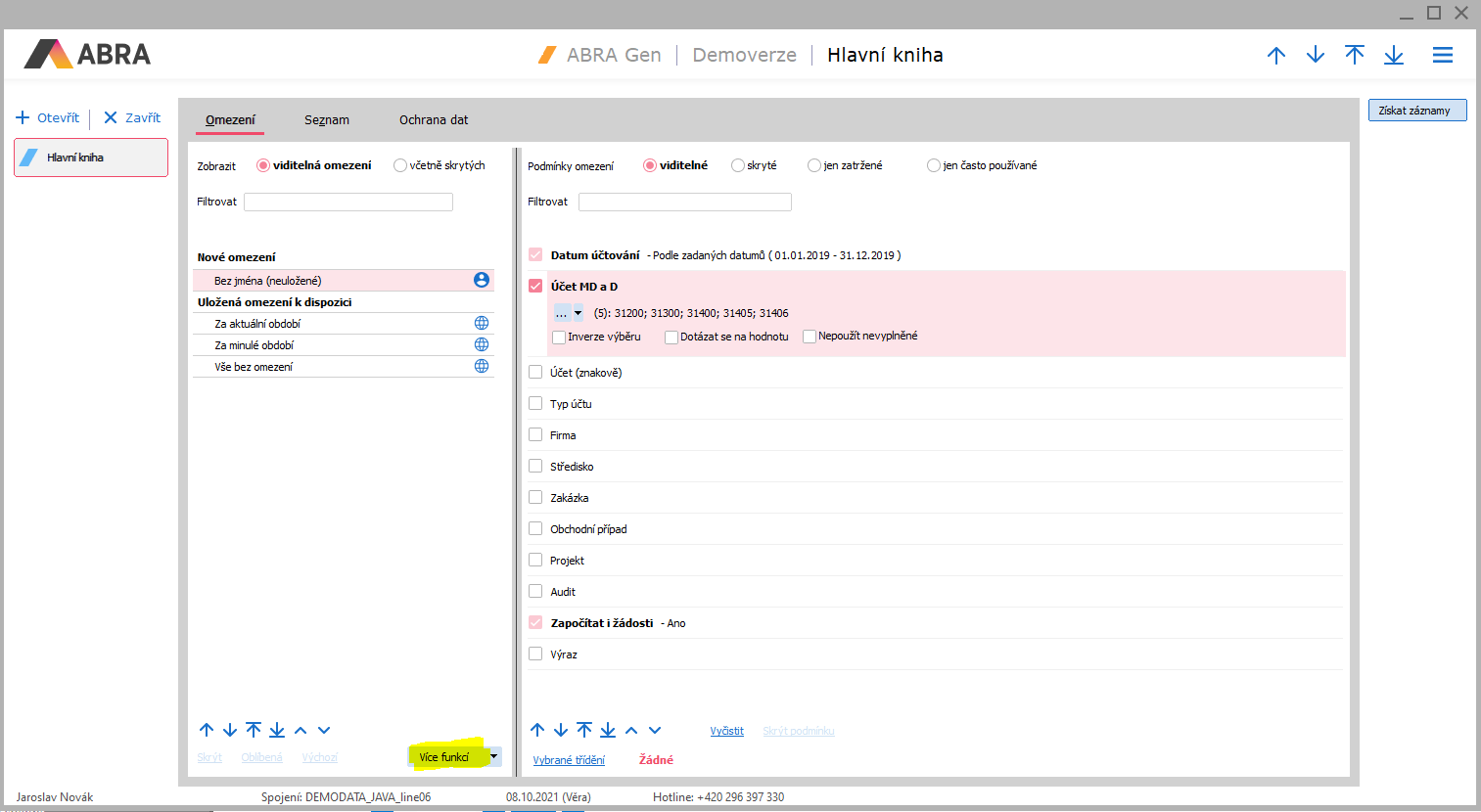 Otevřít agendu Hlavná kniha. Viď modul Účtovníctvo→záložka Zálohy a faktúry→agenda Hlavná kniha. Záložka Obmedzenie může vypadat takto (viz Záložka Obmedzenie - všeobecne):