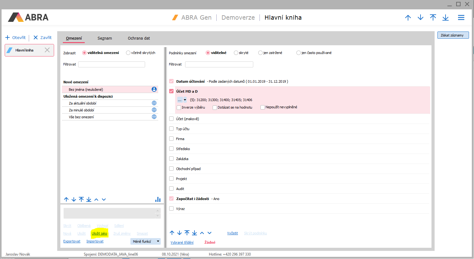 Zadané omezení s nastavením tříděním si lze uložit pro příští použití (stejným způsobem jako v bodě 1).