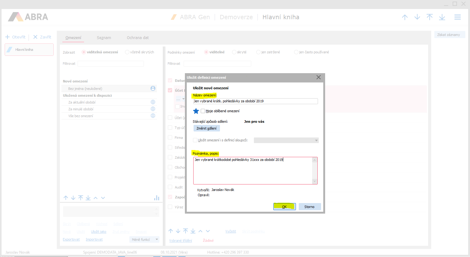 Zadané omezení si lze uložit pro příští použití: