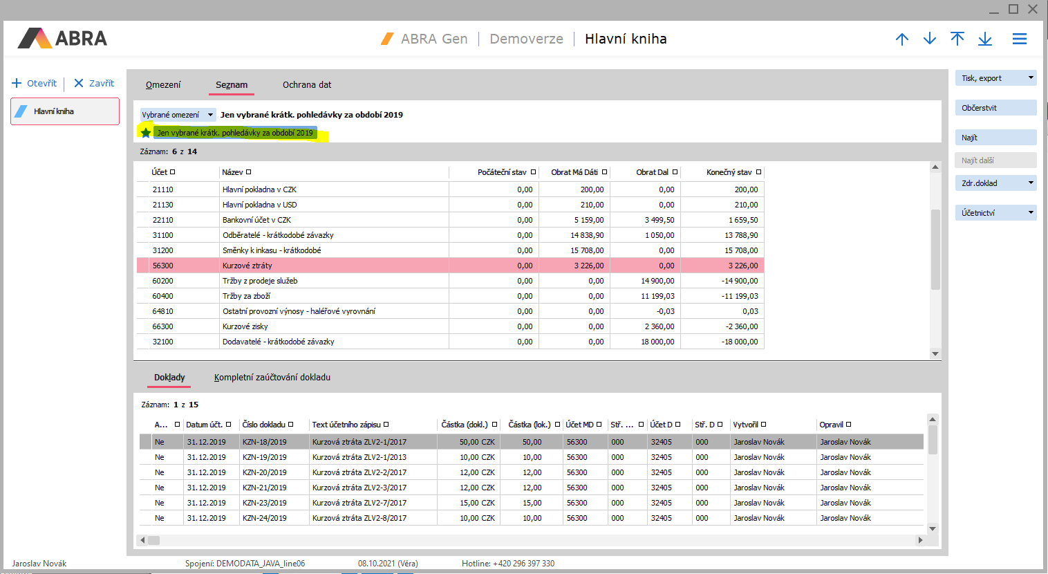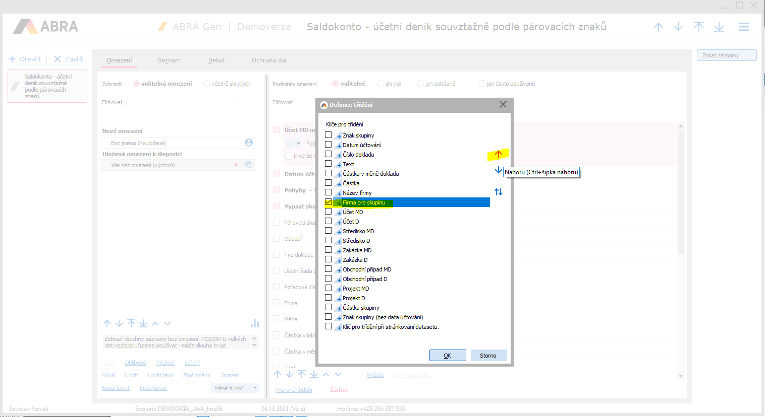Např. viz agenda Saldokonto - účtovný denník súvzťažne podľa párovacích znakov. Zde chceme opakovaně používat totéž omezení a chceme seznam mít vždy stejně setříděný. Zadáme omezení, zadáme třídění a uložíme si to pro příští použití. Postup: