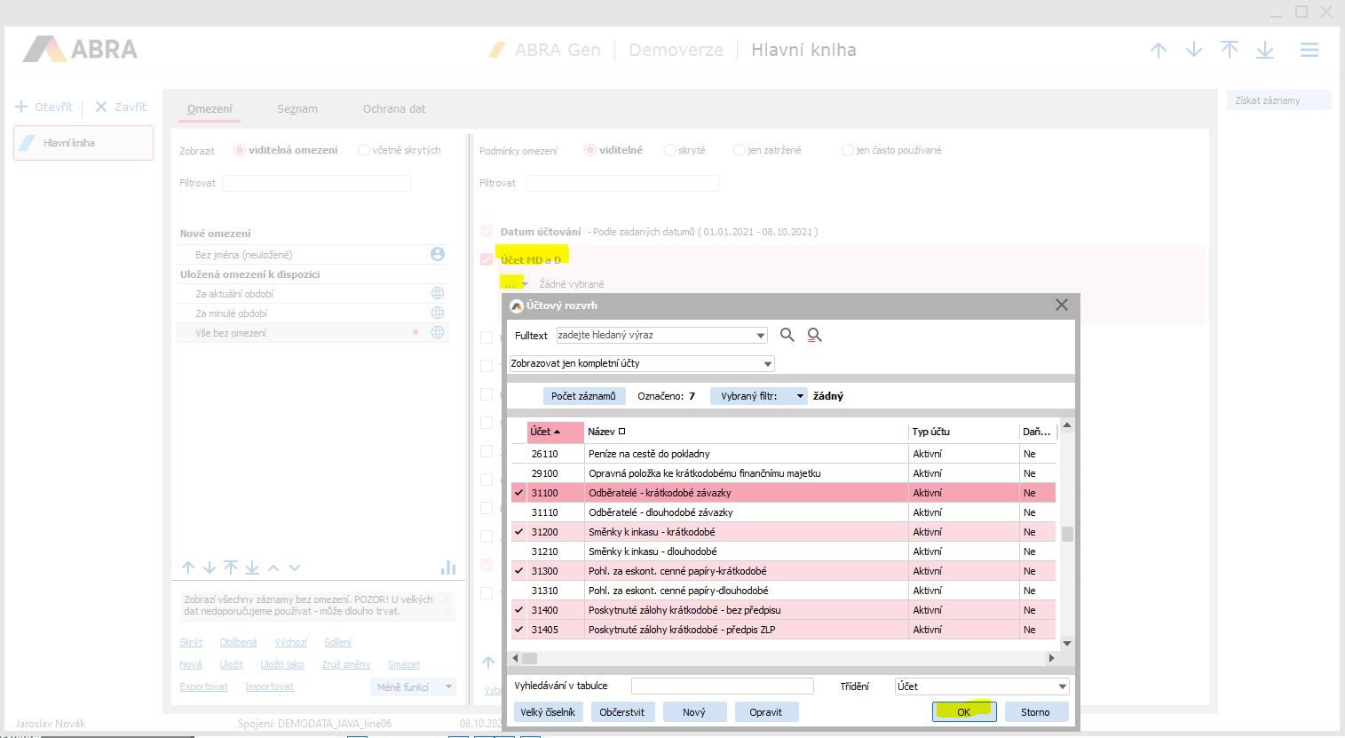 Pokud se mají vypsat pouze některé účty, může se v záložce Obmedzenie ještě nastavit podmínka pro požadované účty. Lze použít položku Účet MD a D a požadované účty vybrat z agendy Účtový rozvrh. Lze označit a vybrat více účtu naráz. (Pravidlá práce so zoznamom (možnosti označovania, triedenia, definície vlastných stĺpcov a pod.) viď kap. Needitovateľný zoznam.) Jsou-li účty označeny, pokračoavt stiskem tlačítka OK: