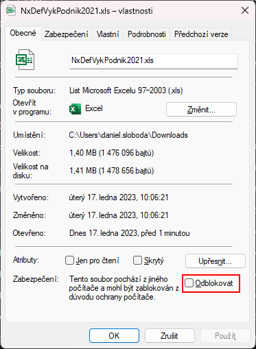 Pokud se vám u stažených výkazů v MS Excel zobrazuje pruh upozorňující na bezpečností riziko (viz obrázek), je nutné ve vlastnostech tohoto souboru ve Windows zatrhnout možnost "Odblokovat" a potvrdit tlačítkem OK.