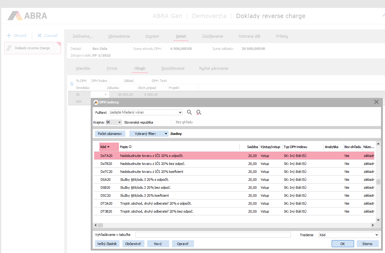 Po uložení nové FP vám systém ABRA Gen nabídne vystavit Doklad reverce charge, do kterého předvyplní hlavičku a řádky pro jednotlivé položky, kde chcete uplatnit daň na vstupu. Po zadání sazby DPH a vyvolání nabídky DPH indexů se zobrazí dostupné DPH indexy pro danou DPH sazbu. V seznamu je celá řada sloupců. Ve výchozím stavu vidíte kód a textový popis DPH indexu a dále je zde řada dalších sloupců.