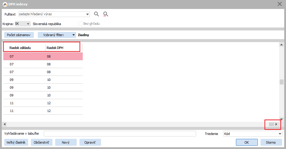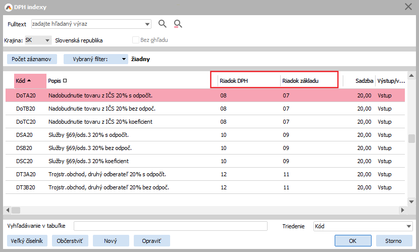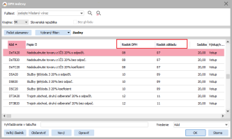 Sloupce "Řádek základu" a "Řádek DPH", které jsou ve výchozím stavu až na konci. Tj. po otevření číselníku ve výchozím stavu nejsou vidět.
