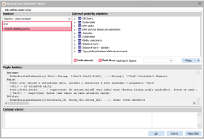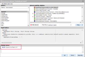 V otevřeném okně klikneme na tlačítko Edituj a v otevřeném okně v pravé části z datového setu ze sekce Main vybereme volbu QunatitySum a dvakrát klikneme myší. Ve výrazu tedy budeme mít MAIN.QuantitySum. K tomu musíme přidat podmínku, že chceme jen záznamy vyšší než s množstvím 100. Celý výraz bude vypadat následovně: