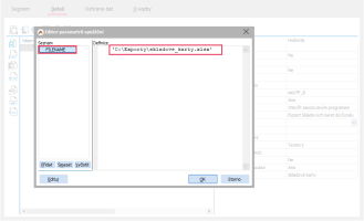 Parametry spuštění - kliknutím na tři tečky otevřeme obrazovku, kde do levé části přidáme kliknutím na tlačítko Přidat parametr FILENAME, a do něj poté v pravé části navolíme cestu, kam budeme chtít soubor exportovat, a koncovku souboru, který si přejeme vytvořit. V našem případě to bude 'C:\Exporty\skladove_karty.xlsx'.
