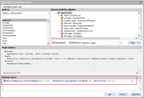 Budeme-li chtít formátovat sloupec s množstvím na skladě 01 na dvě desetinná místa, použijeme funkci FormatNumeric. V této funkci zadáme nejprve v prvním parametru masku, tedy jak budeme chtít formátovat (maska se zadává jako řetězec, tedy do apostrofů) a druhý parametr bude formátované číslo. Celý výraz bude vypadat následovně: