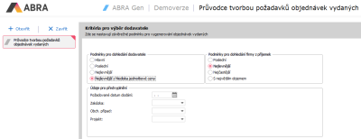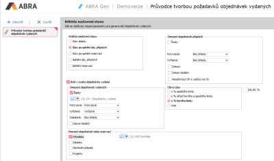 V tomto návodu si ukážeme, k čemu lze v systému ABRA Gen využít Sprievodca tvorbou požiadaviek objednávok vydaných. Tento průvodce se spouští funkcí Průvodce v agendě Požiadavky na objednávky vydané.