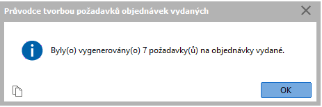 Po dokončení průvodce tvorbou požadavků objednávek vydaných se objeví systémové hlášení, kolik dokladů Požadavků na OV bylo vygenerováno.