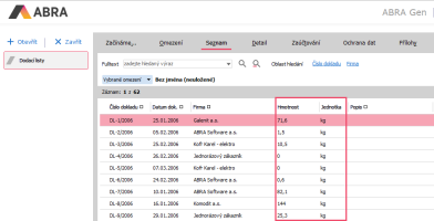Na příkladech výše jsme si objasnili, jak se zobrazují jednotky, pokud je na dokladu více typů hmotností. Pokud je pouze jedna, zobrazuje sloupec Hmotnost právě tu.