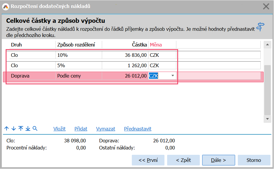 V dalším kroku se zadávají hodnoty pro jednotlivé vedlejší pořizovací náklady, v našem případě pro jednu sazbu cla a pro dopravu. U dopravy volíme způsob rozpočítávání nákladů. Můžeme si zvolit, zda se má doprava rozpočítat s ohledem na cenu zboží, jeho hmotnosti, jeho množství nebo jeho objem.