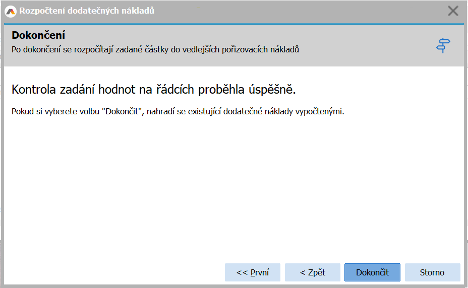 Po těchto dvou krocích dojde k ukončení průvodce rozpočítávání nákladů a náklady se automaticky rozpočítají.
