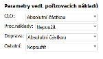 Na dokladu Príjemka se na záložce Detail na subzáložce Hlavička nachází sekce Parametry vedl. pořizovacích nákladů, kde vybíráme, zda budeme zadávat některé z vedlejších pořizovacích nákladů. V sekci jsou 4 druhy možných nákladů a u každého z nich je možnost zvolit jeden ze tří možných způsobů rozpočítávání nákladů, viz obrázek níže.