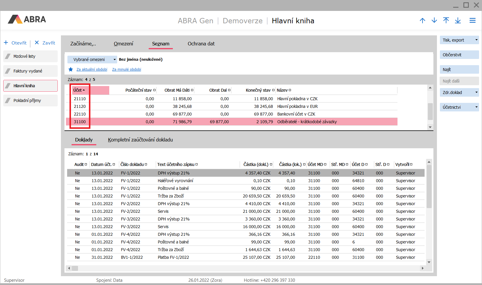 Otevřete agendu. Viď modul Účtovníctvo→záložka Zálohy a faktúry→agenda Hlavná kniha. Nejdříve vyberte správné omezení: