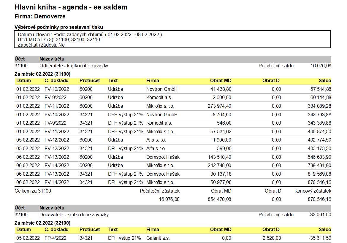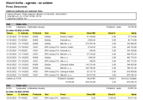 Pokračujte stiskem tlačítka Získať záznamy. Zobrazí se výpis z hlavní knihy jako v předchozím případě, pouze bude zafiltrovaný za vybrané účty: