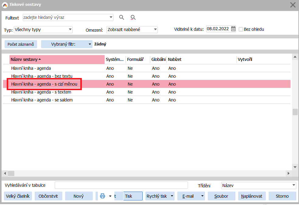 Pro kontrolu účtů s cizí měnou je ve stejné tiskové nabídce k dispozici následující tisková sestava: "Hlavní kniha - agenda - s cizí měnou":