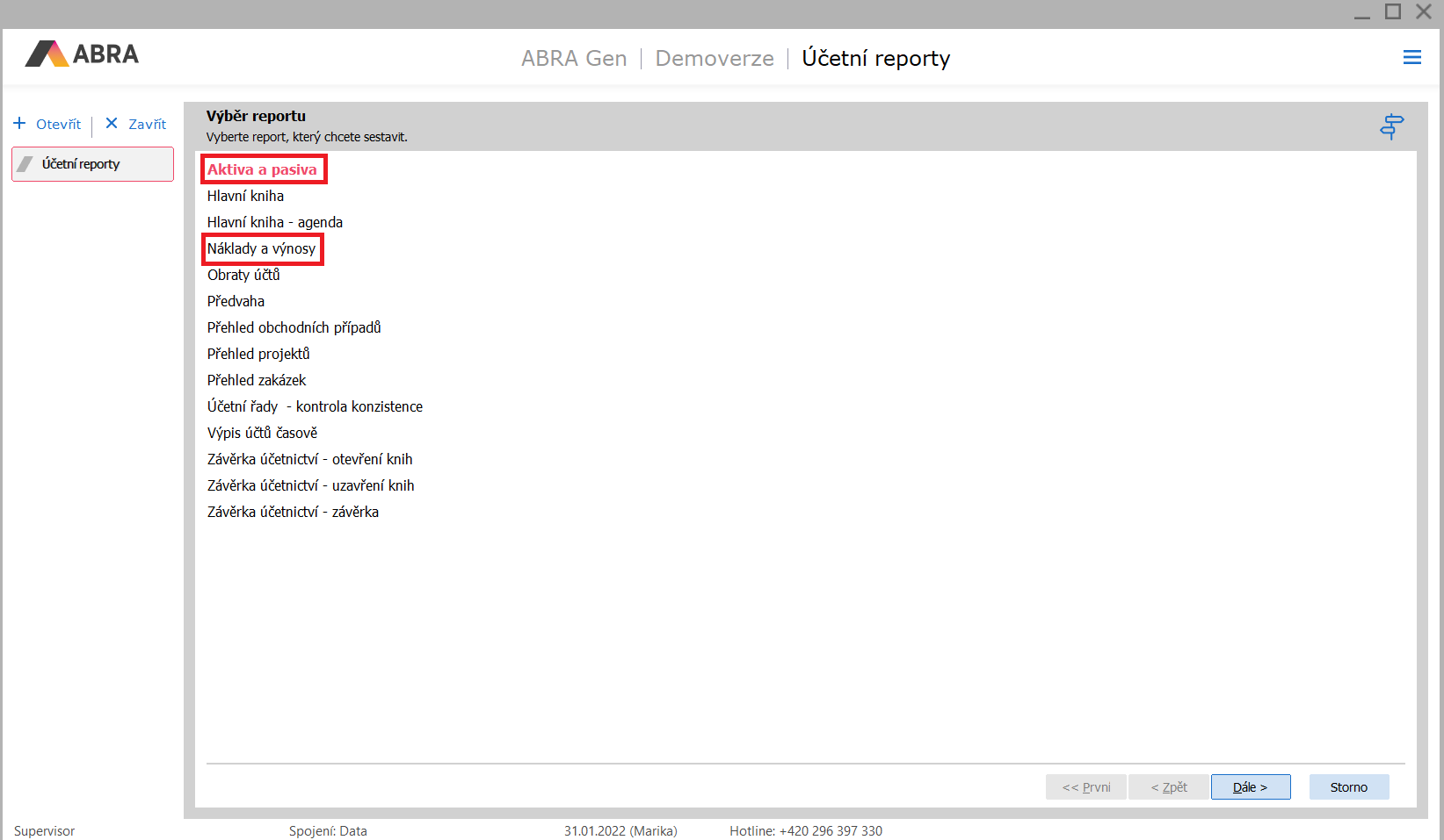 V agendě Účtovné reporty lze vytisknout výkazy "Aktiva a pasiva" a dále "Náklady a výnosy". V těchto tiskových sestavách se oproti výkazu z téže tiskové nabídky tisknou pro kontroly významné celkové součty za aktiva, pasiva, náklady a výnosy.