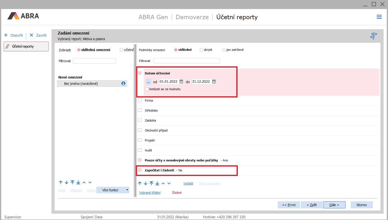 Pokud se mají vypsat pouze některé účty, může se v záložce Obmedzenie ještě nastavit podmínka pro požadované účty.