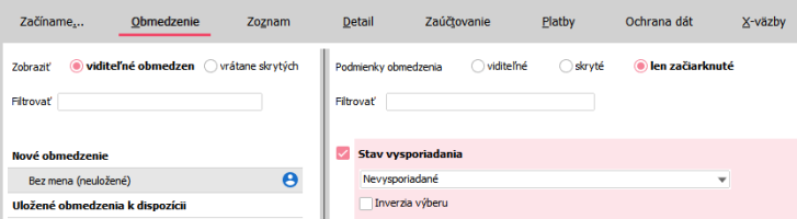 Podobný výsledok môžeme dosiahnuť i bez nutnosti vytvárať vzájomný zápočet. V obmedzení je možné použiť inú podmienku Stav vysporiadania: