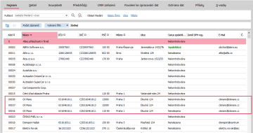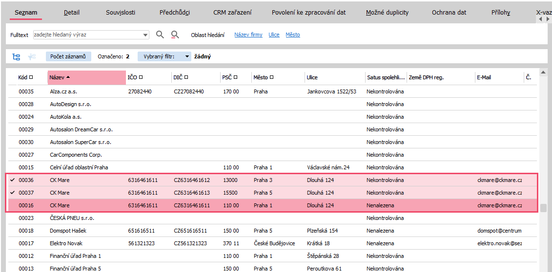 V našem příkladu budeme slučovat firmu, kterou máme v adresáři 3x. Máme u ni vyplněny stejné informace až na adresu a PSČ.